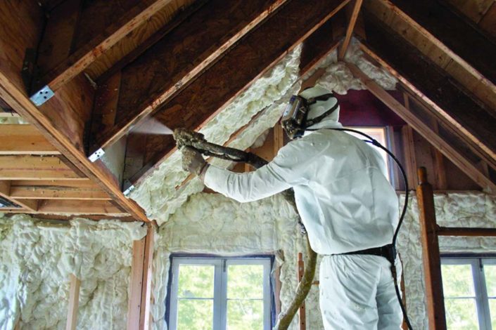 - Proyección de aislamiento tipo poliuretano proyectado: se trata de una capa de espuma de polietileno proyectada, de 30 mm de espesor mínimo, protegida con pintura o elastómero de poliuretano. Recomendada para fachadas medianeras en derribos y fachadas interiores. Actualmente se siguen utilizando por su bajo coste y rápida ejecución, consiguiendo espesores aplicados en varias capas hasta 10 cm.