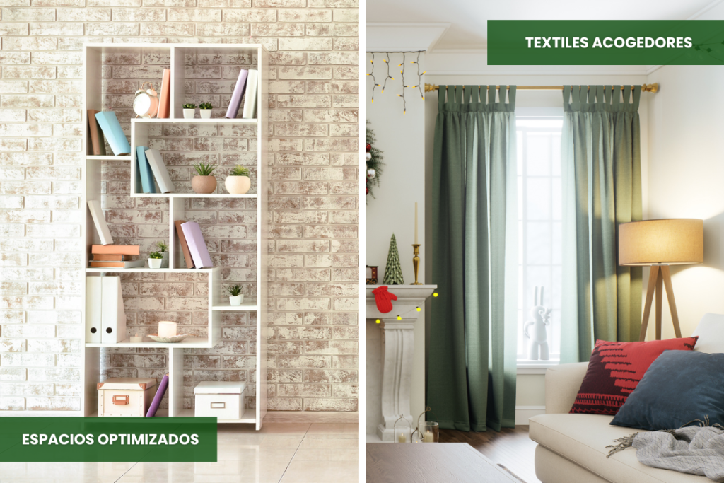 Los textiles son una forma económica y efectiva de renovar tus espacios. Cojines, mantas y cortinas en materiales accesibles como algodón, poliéster o mezclas sintéticas aportan estilo y calidez. Al elegir colores, puedes combinar los clásicos de las festividades, como rojo, verde y dorado, con tonos modernos de temporada, como terracota, azul petróleo o beige. También considera incluir colores que reflejen tu personalidad o las preferencias de tu familia, asegurando un espacio único y acogedor.